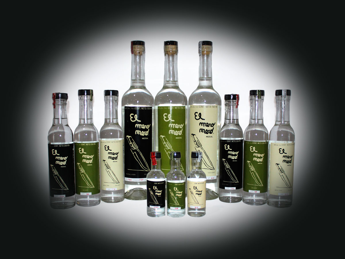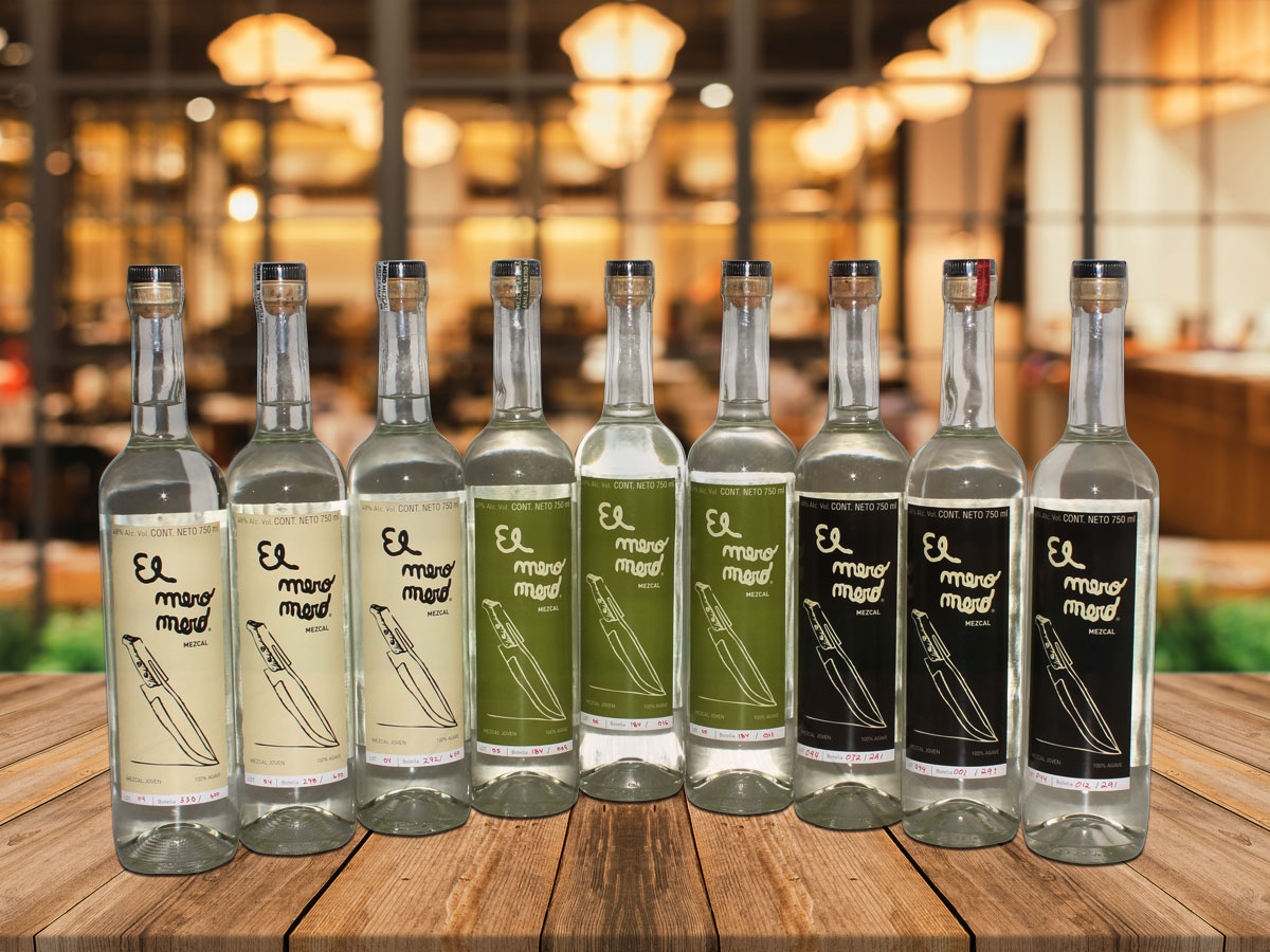 Las tres variedades de El Mero Mero Mezcal se presentan en botellas de 750ml, 250ml y 50ml